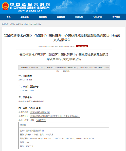 2022年2月28日,武漢經(jīng)開區(qū)發(fā)布?xì)淠茉磮@林車項(xiàng)目中標(biāo)公告,開沃、金龍等品牌車型中標(biāo),眾宇將為其提供氫燃料電池系統(tǒng)。